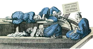 Λίγοι μήνες απομένουν για να εκπνεύσει το 2021. Έτος εορταστικό μας είχαν πει· επειδή συμπληρώνονται διακόσια χρόνια από το 1821, έτος επαναστατικό. Οι όποιοι εορτασμοί δεν προκαλούν ως τώρα ιδιαίτερα ρίγη συγκίνησης. Παρά την πληθώρα δημοσιεύσεων από ειδικούς και μη διαπιστώνει κανείς συχνά μια συγκατάβαση και κάποτε μια θυμηδία, η οποία φτάνει ανέτως μ’ έναν πήδο ως την αλύπητη ροΐδεια σάτιρα, όπως μαρτυρεί το παιγνιώδες μυθιστόρημα Η Επιτροπή του Αλέκου Σμπαρούνη (Νεφέλη 2021). Έφταιξε μήπως η προέλαση του κορονοϊού; Πιο πολύ βάρυνε η δυσπιστία απέναντι στη θεσμική οικειοποίηση του ορόσημου «1821», μια δυσπιστία με ρίζες στα